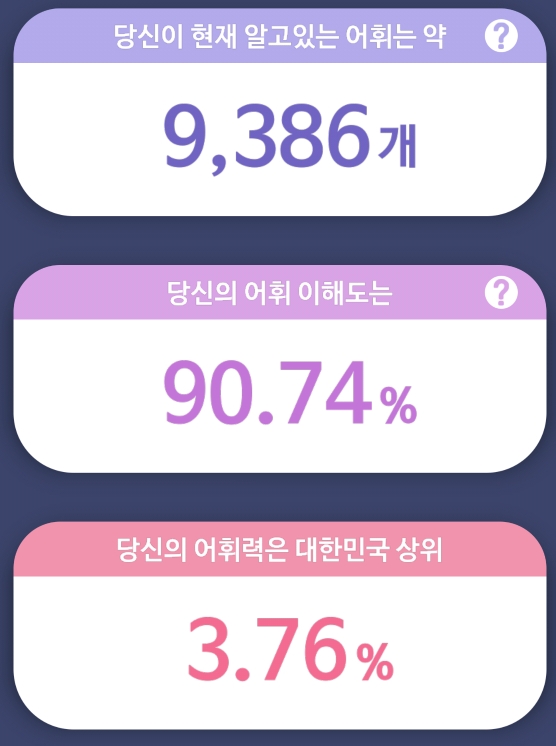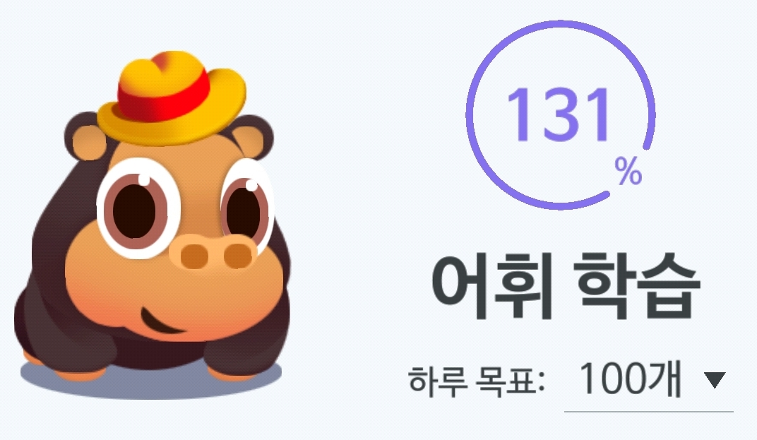 요즘 어휘력 측정을 할 때마다 0.02%씩 올라 기분이 좋습니다. 확실히 100 단어 이상씩 하니까 빨라진 것이 있습니다. 알고 있는 어휘도 오늘만 26개 늘어났습니다.